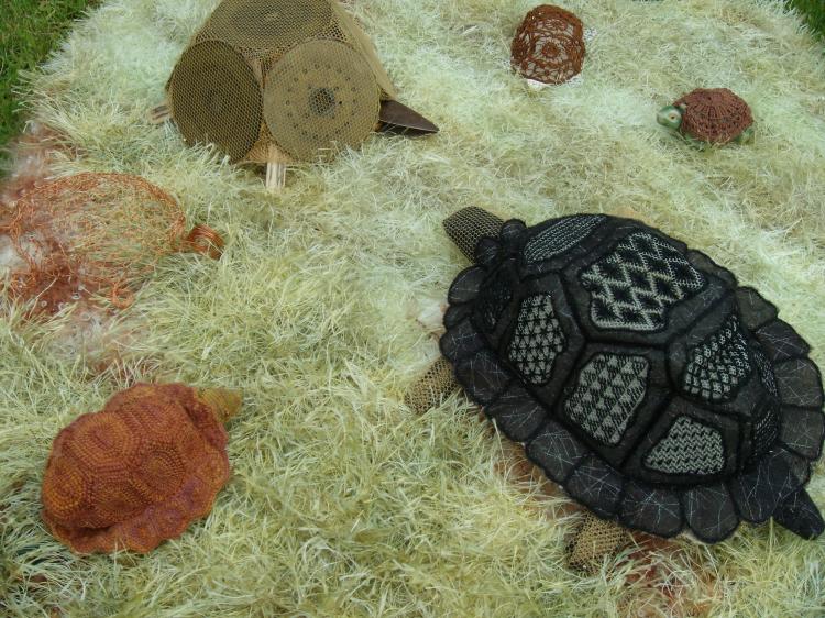 Six of the fourteen small tortoises Bottom left is Primo the first of the tortoises I made, and the only one to copy in detail the shell of a real animal, worked entirely in corded buttonhole stitch (10cm long) Above Primo is Bob, worked in copper wire over a polystyrene egg starting in the middle and working outwards in Torchon ground with ends of the wire making the head and feet. Then there is Felkin named after the author of the classic book on machine laces, constructed from the round bobbins of a bobbinet machine, with feet of hooks from a knitting machine. The large black tortoise is Carrie, her 18cm x 20cm shell is Carrickmacross worked with a black glittery fabric couched over fine net, unwanted fabric cut away and spaces filled with a variety of embroidery stitches. The little tortoises at the back are Celia and Fred