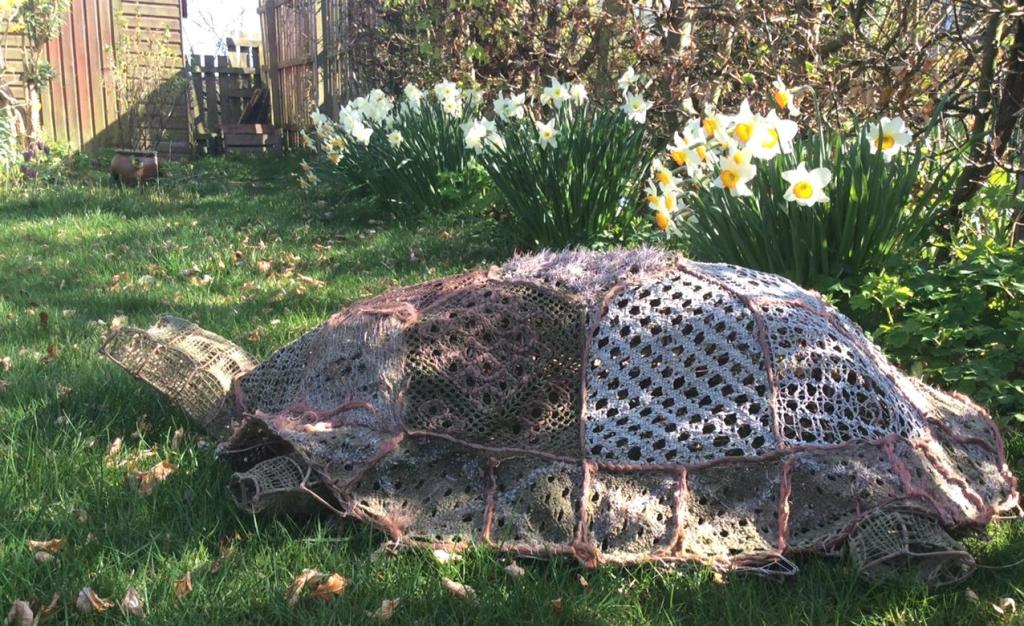 Charlie was quite large (90cm long) inspired by Charles Darwin’s observations on the divergence of characteristics to be found in otherwise similar species on the Galapagos Islands, in particular the giant tortoises. The framework was a garden mesh, with head and feet darned like filet lace with thick wool from Castle Milk Moritz sheep. The shell was an opportunity to experiment with a range of bobbin lace stitches using a variety of thick threads from raffia to novelty knitting yarns.