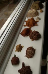 Alongside Charlie at the Knitting and Stitching shows were fourteen little tortoises made using a variety of lace and lace-related techniques.