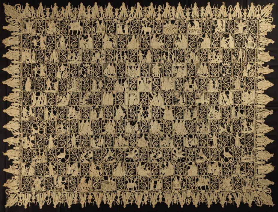 It is not known whether the coverlet was commissioned, if so who by, or if it was a group project that grew as more lacemakers became involved. One possibility is that it started early in the seventeenth century with a small group making a border for a linen cloth; later, when other lacemakers became interested in the new techniques, a decision was made to work the entire coverlet in bobbin lace. It is a great example of a collaborative project, involving not only the many lacemakers who worked the lace and the seamstress who stitched it all together, but the artists and engravers who produced the original images and the individuals who planned the coverlet and prepared patterns for all the sections. Not forgetting the people who grew and processed the flax and those who spun the fine linen thread.