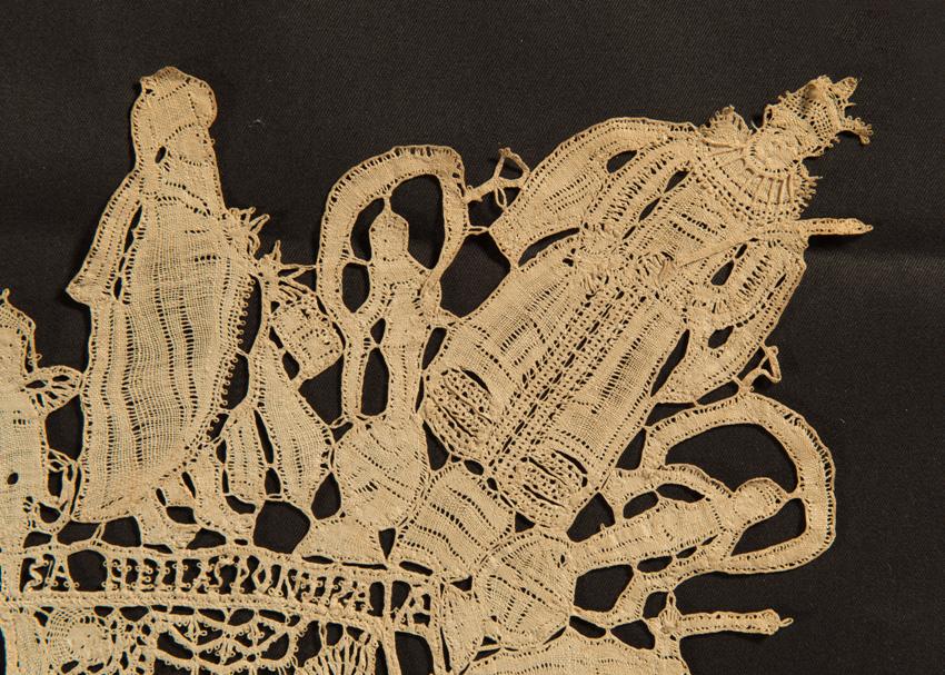 The makers are unknown; however they must have been skilled lacemakers who had grown up handling linen thread, probably spinning flax from childhood. It is likely they lived in a convent in the country we now know as Belgium, where they had access to a wide variety of high-quality religious and historical images, and had time to make lace without domestic responsibilities. Several of the squares contain pictures of the Archdukes and one square has the couples’ initials topped by a crown, indicating clearly that the coverlet was made for them.