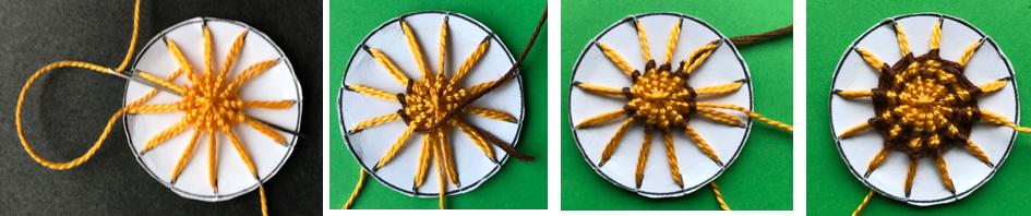 7. Continue stitching round the spokes, each time going back over one spoke, then forward under two; tension the first rounds of stitches firmly to ensure a neat centre. (H)