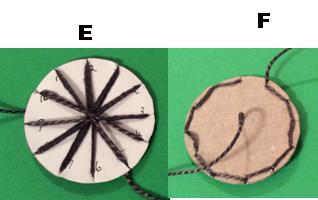 5. Come up at 12 and go round again starting 12 to 6, coming up at 7 then going down at 1…. this round will result in double threads on most spokes (E) and will fill in the gaps at the back of the disc (F) – come up at 6.