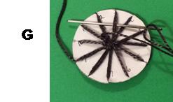 3. Take thread across disc to 2, up at 3, back to 9. … Keeping the thread tight, continue until thread goes down at 11 – there will be no spoke at 6. (C)