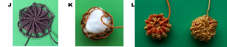 13. Insert filling and complete gathering until the button is firm and stitch to close the back. (K)